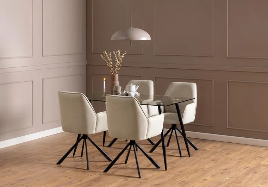 Wenn Sie zeitlose Eleganz in der Wohnung lieben, ist der Stuhl Glenda von Actona die perfekte Empfehlung. Er gefällt durch seine ergonomische Form mit hohem Rücken, bequemen Armlehnen und guter Polsterung, die gemütliches Sitzen und Wohlbehagen versprechen. Der Bezug in leicht melierter Optik fühlt sich angenehm an und ist sehr pflegeleicht. Stabilen Halt geben dem drehbaren Stuhl Glenda die vier schlanken Metallbeine.