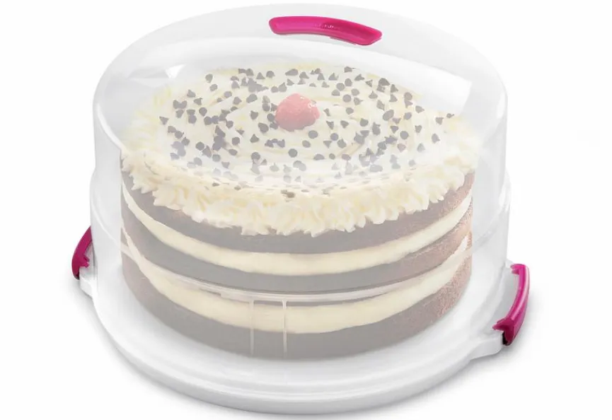 Im Tortenbehälter Ø 36 cm finden leckere Backwerke ihren Platz, um unter der durchsichtigen Glocke sicher transportiert werden zu können. Die farblich abgesetzten Klickverschlüsse sorgen dafür, dass die Tortentransportbox fest verschlossen bleibt. Am ergonomisch geformten Griff halten Sie den Tortenbehälter Ø 36 cm ganz leicht im Gleichgewicht.