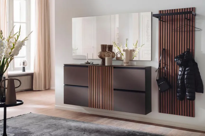 - Garderobe aus Klappen-Hängeschrank, Spiegel und Garderobenpaneel