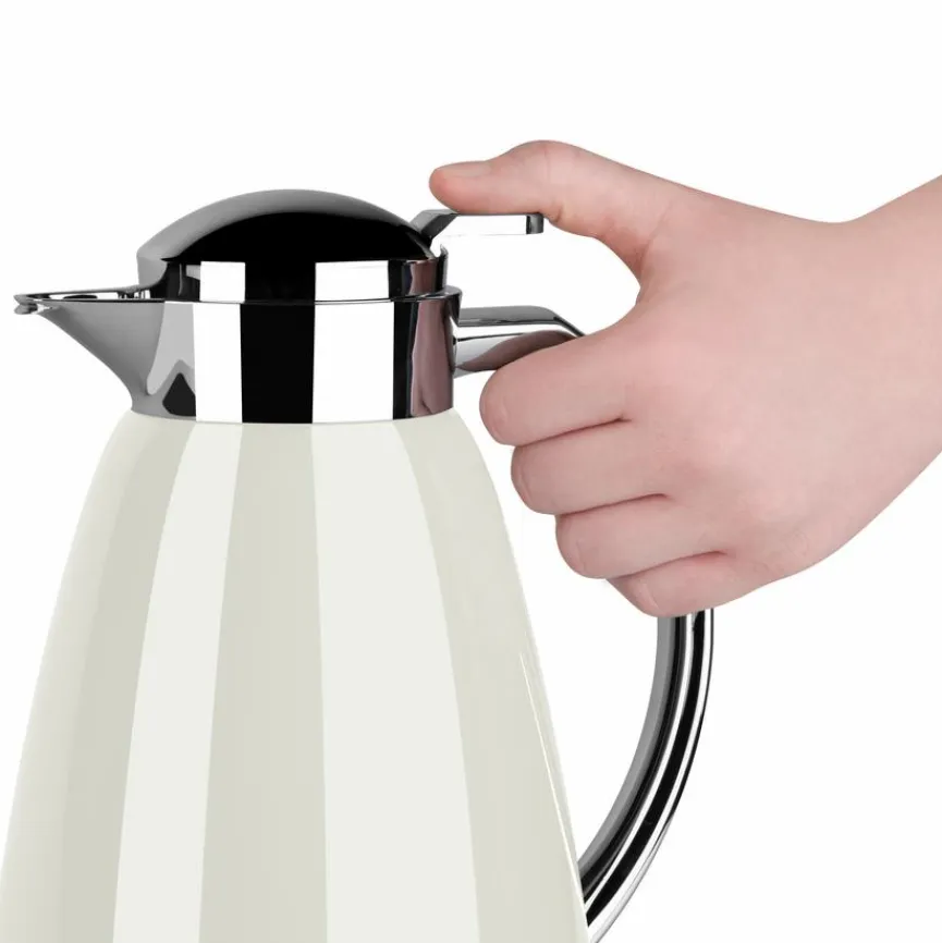 Eine nach oben hin verjüngende Form und ein elegant designter Griff bestimmen das Erscheinungsbild der Isolierkanne Campo aus dem Hause Emsa. Die Kanne wirkt zeitlos und harmoniert mit vielen Tafelservices. Für den Komfortfaktor sorgt bei der Isolierkanne Campo von Emsa die Einhandbedienung.