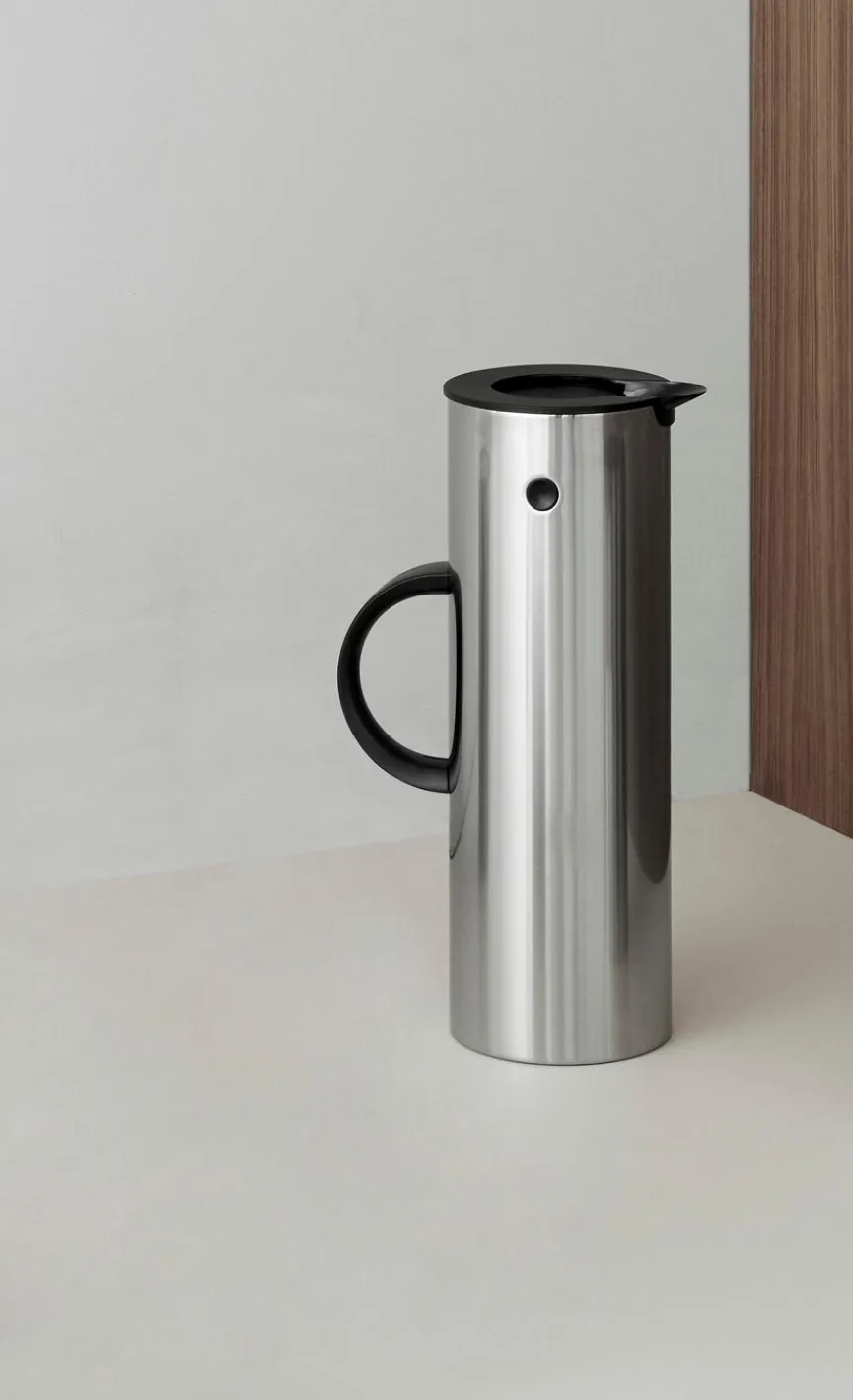 Der dänische Designer Erik Magnussen gehört zu den großen Kreativen der seit vielen Jahrzehnten einflussreichen skandinavischen Designbewegung für Gebrauchsgegenstände und Inneneinrichtungen. Ende der 70er Jahre entwarf der gelernte Keramiker im Rahmen der Metallkollektion Cylinder Line der Kopenhagener Firma Stelton die Isolierkanne Erik Magnussen, Classic. Der zylinderförmige Kannenkörper zeigt eine schlichte, elegante Formensprache, sodass sich die Isolierkanne EM77 von Stelton nahtlos in moderne und klassische Wohnwelten einfügt. Ihr praktischer Kipp-Mechanismus macht ein Ausschenken möglich, ohne dass zuvor der Deckel geöffnet werden muss.