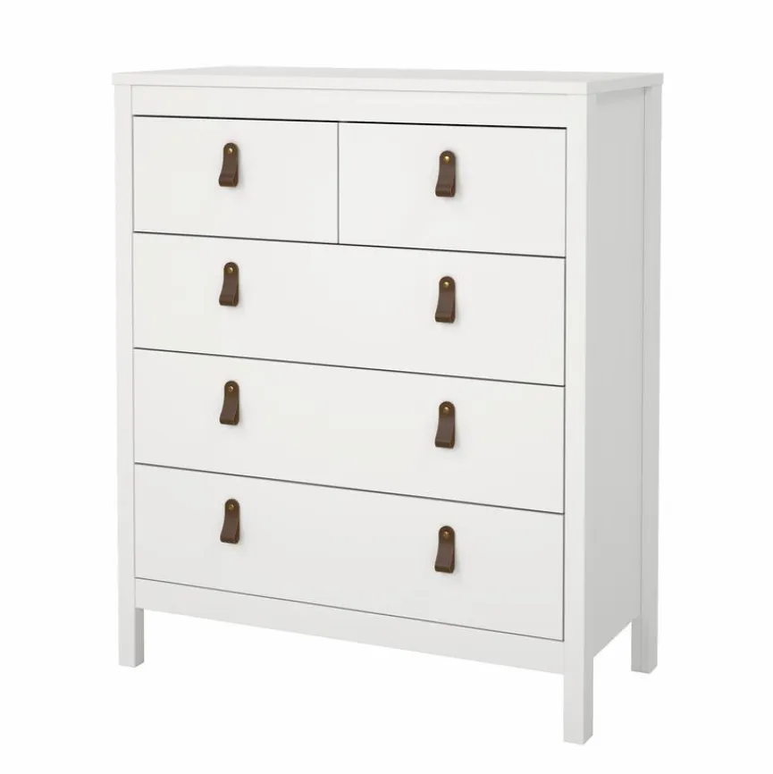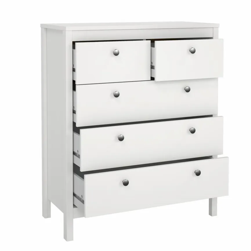 Die Kommode Madrid der Marke Tvilum besticht mit ihrem angesagt schnörkellosen Design, wodurch sie sich mühelos in verschiedene Einrichtungsstile einfügt. Mit fünf Schubkästen bietet sie Ihnen außerdem viel Stauraum für Nützliches und Liebgewonnenes, sodass alles einen festen Platz findet. Besonders hübsch wirkt die Kommode Madrid mit Grünpflanzen, Lampen oder persönlichen Dekoelementen ergänzt.