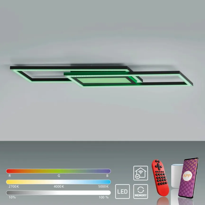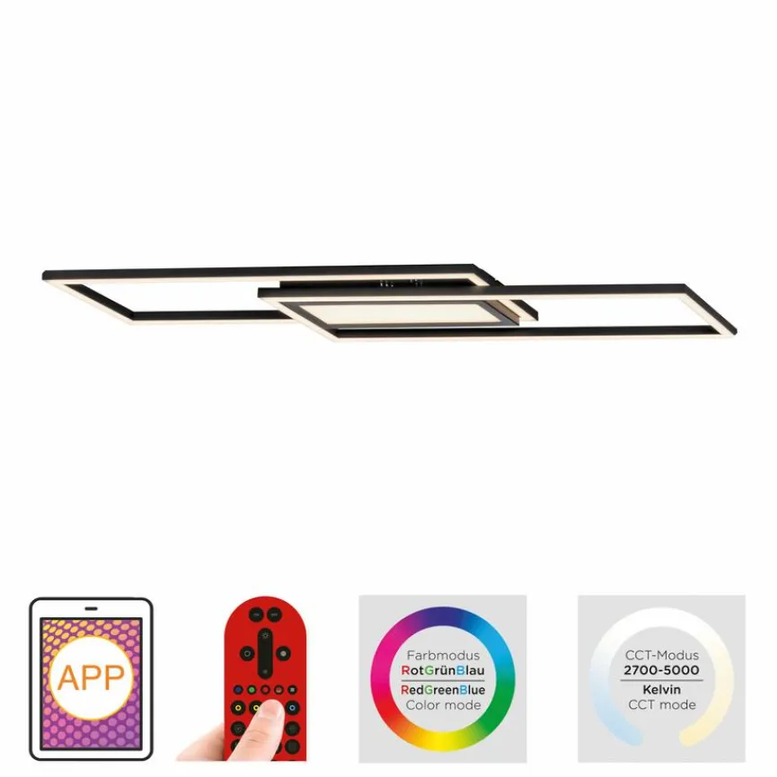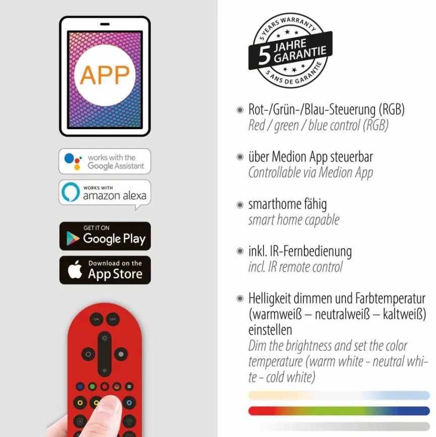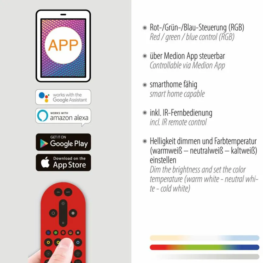 - Mit Fernbedienung zum Dimmen, Einstellen der Farbtemperatur (2.700 -5.000 Kelvin, Farbwechsel (RGB) und das Einstellen unterschiedlicher Lichtszenen oder per App steuerbar