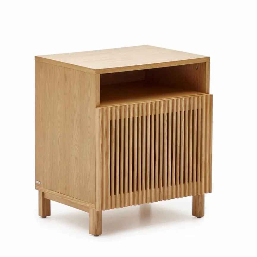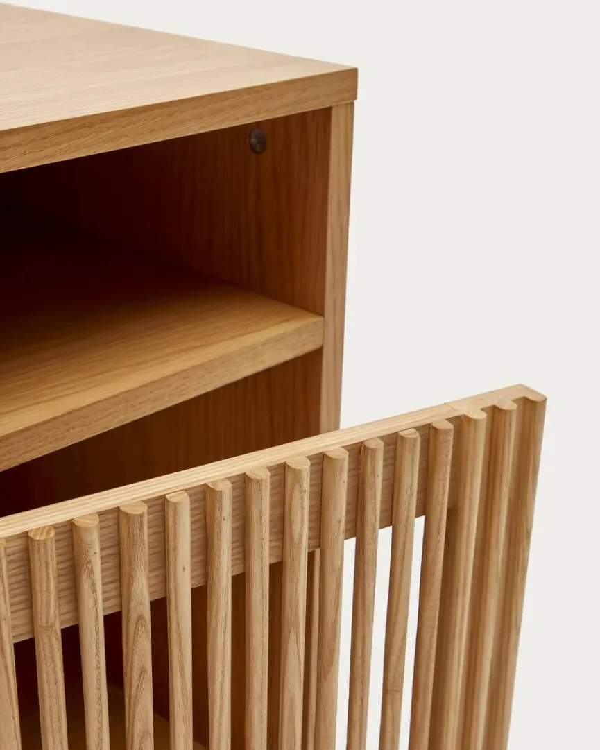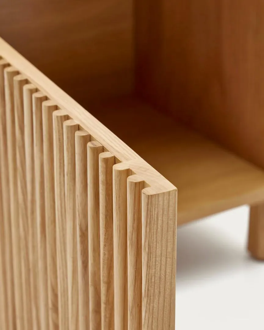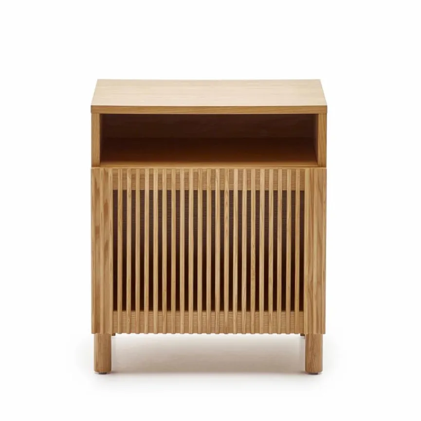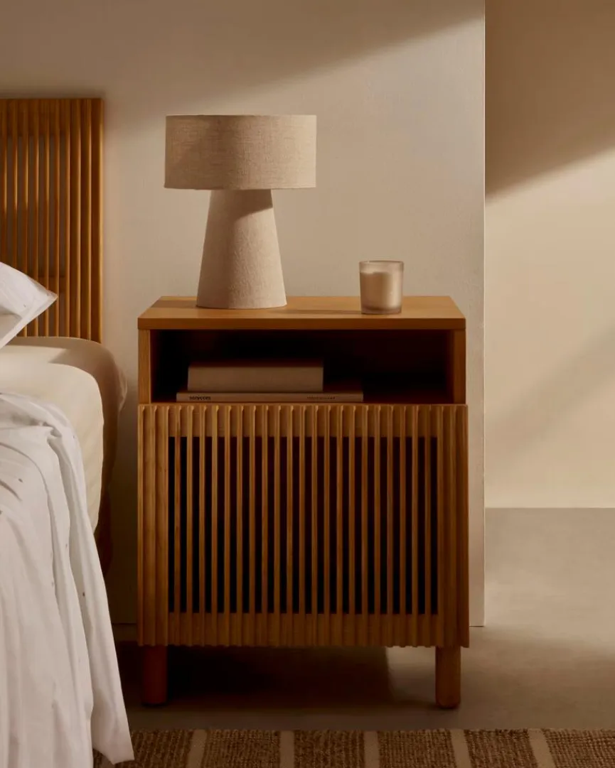 Der Nachttisch Beyla von Kave Home vermittelt Gemütlichkeit und originellen Charme. Eine Lamellenfront, die ein reizvolles Licht- und Texturenspiel mit sich bringt, macht das gewisse Etwas dieser Nachtkonsole aus. Mit einem Bett und anderem Interieur im Scandi-Design kann der Nachttisch Beyla zum Beispiel ausgesprochen gut harmonieren.