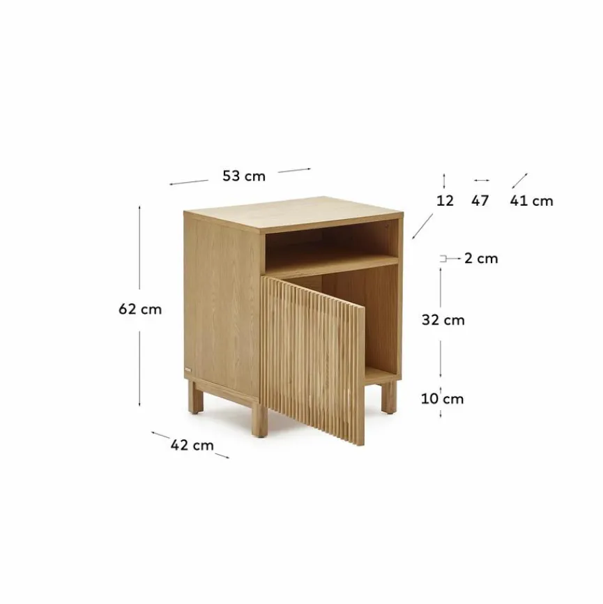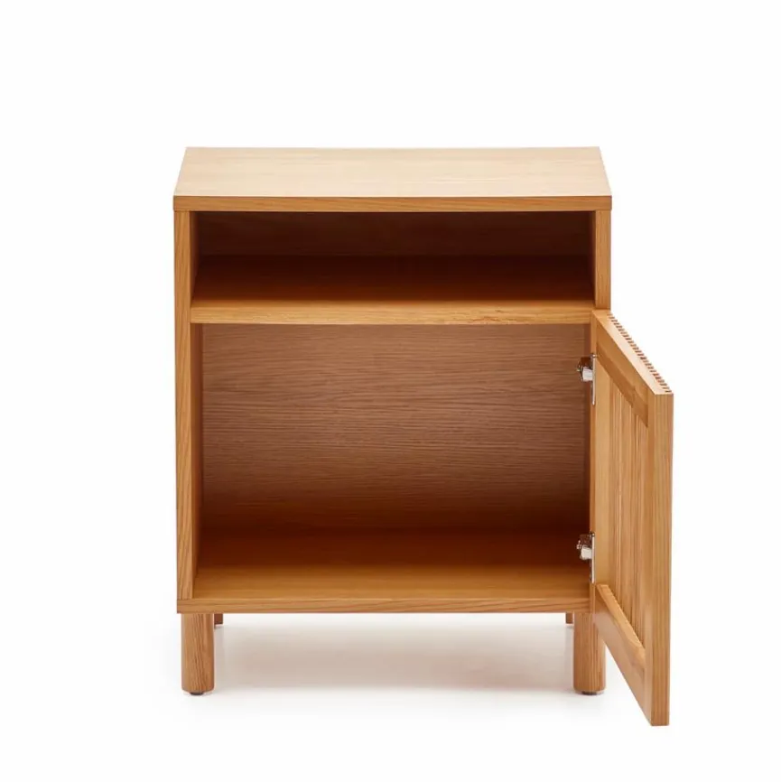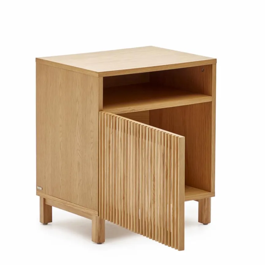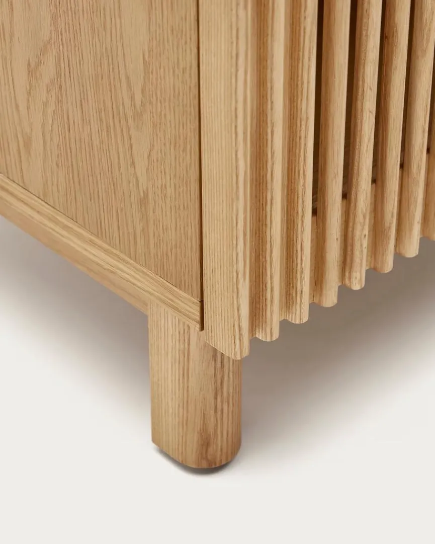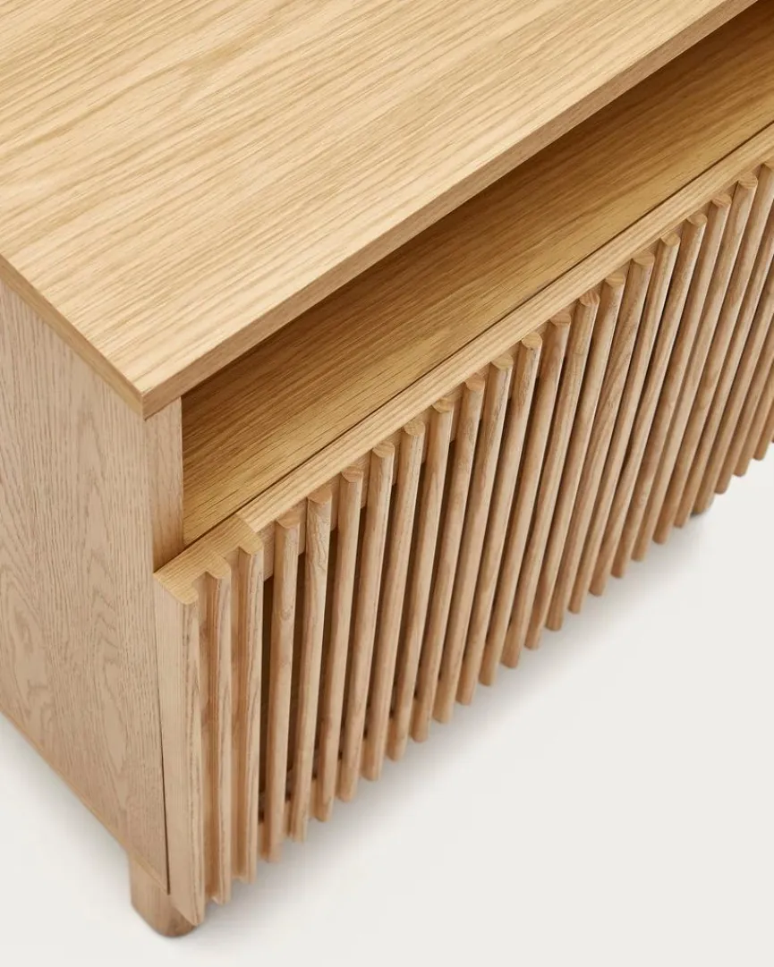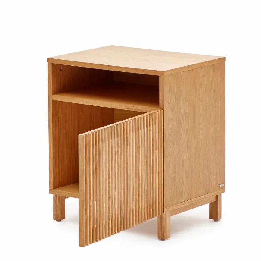 Der Nachttisch Beyla von Kave Home vermittelt Gemütlichkeit und originellen Charme. Eine Lamellenfront, die ein reizvolles Licht- und Texturenspiel mit sich bringt, macht das gewisse Etwas dieser Nachtkonsole aus. Mit einem Bett und anderem Interieur im Scandi-Design kann der Nachttisch Beyla zum Beispiel ausgesprochen gut harmonieren.