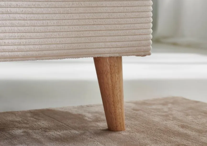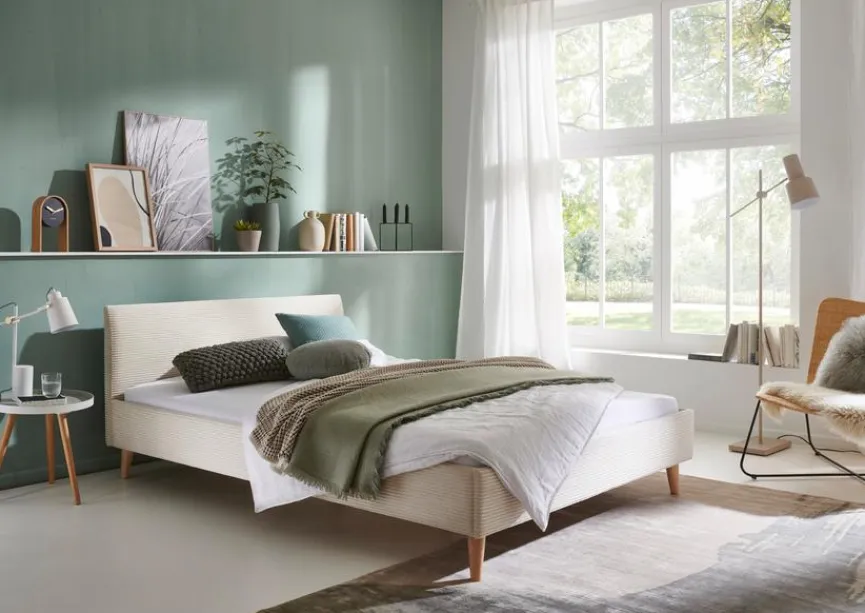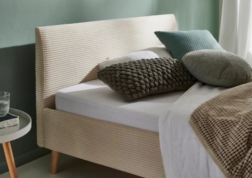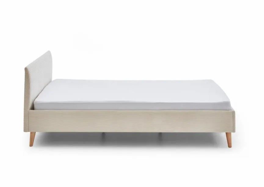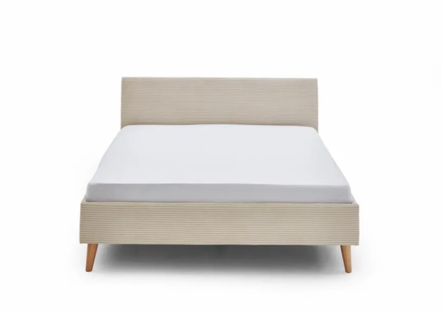 - Bettgestell aus Holzwerkstoff, Füße aus massivem Gummibaumholz in eichefarbig, Bezug Cord-Stoff in beige