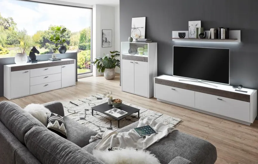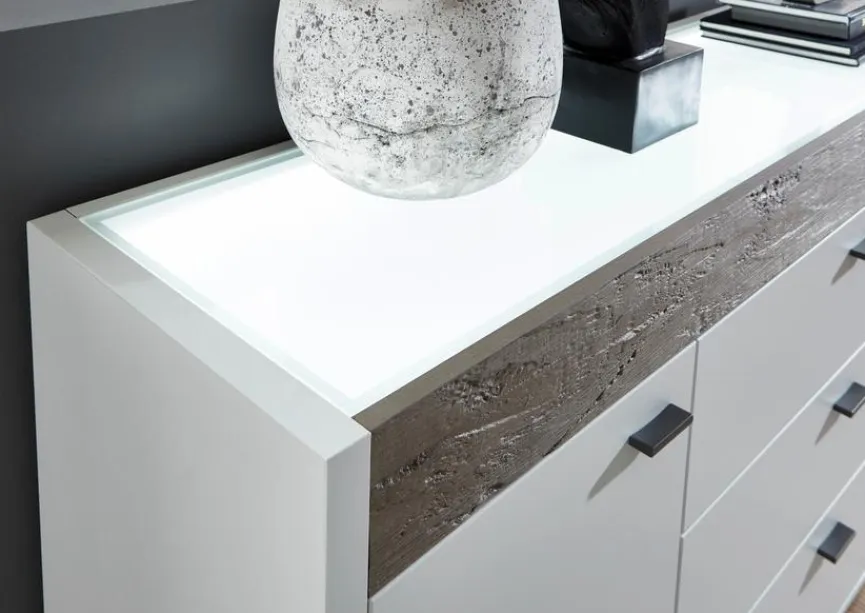 - Korpus aus Holzwerkstoff (Spanplatte) mit kratzfester Melaminharzfolie in „Modern White“, Front aus Holzwerkstoff (MDF) mit hochwertiger Dekorfolie in „Modern White“, Front-Absetzung in Kastanie Echtholz furniert