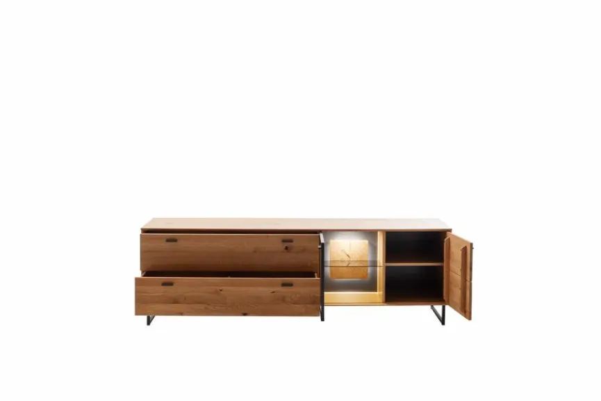 - Front aus Ast/Balkeneiche massiv, durchgehende Lamelle in Wildeiche geölt, Korpus aus Ast/Balkeneiche furniert in Wildeiche geölt
