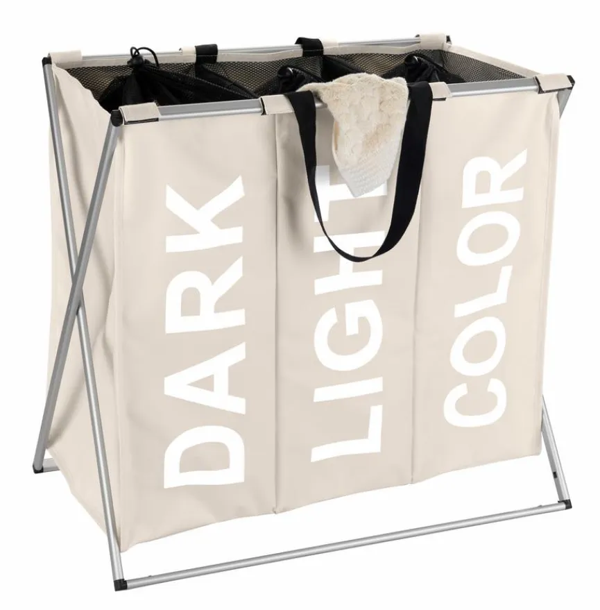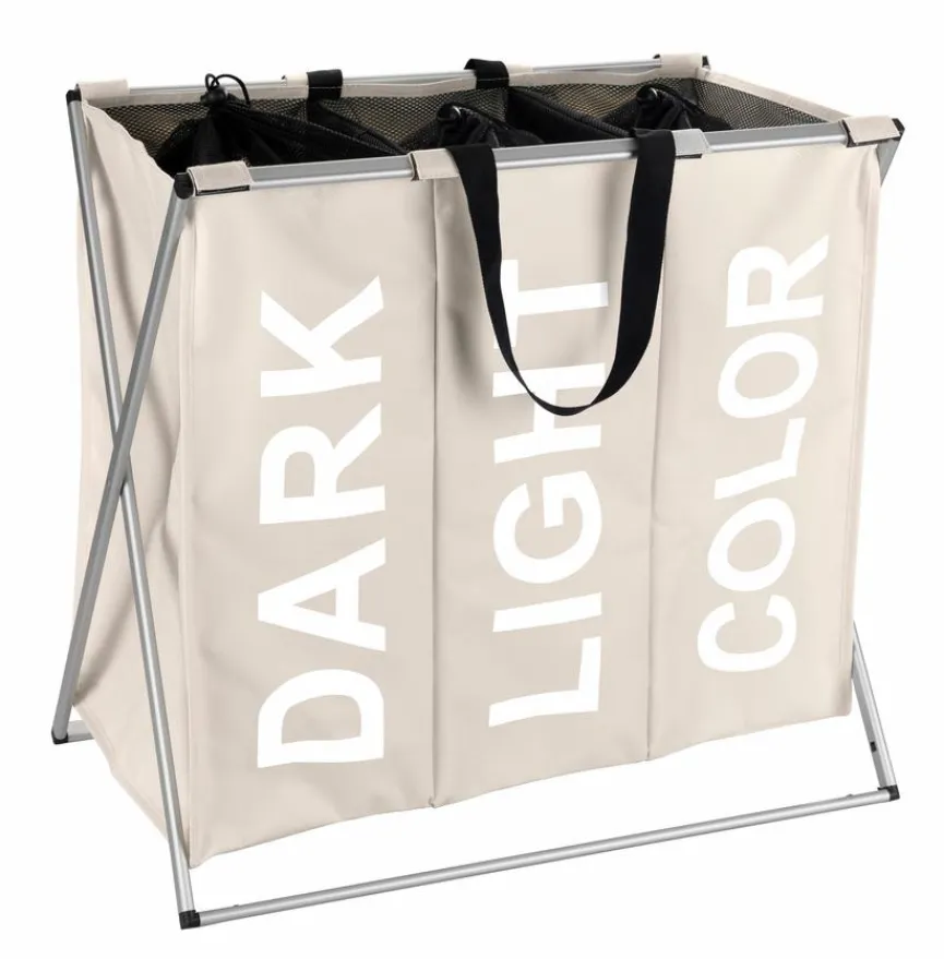 Auf dem modern designten Wäschekorb Trio von WENKO sind die Worte „DARK“, „LIGHT“ und „COLOR“ groß geschrieben. So fällt das Sortieren der Wäsche einfacher. Der mit jeder Menge Platz aufwartende Wäschekorb Trio aus dem Hause WENKO steht dank der praktischen Tragegriffe zudem für eine einfache Handhabung.
