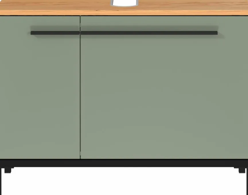 - Korpus und Front aus Holzwerkstoff (Spanplatte) mit kratzfester Melaminharzfolie in Taupegrün