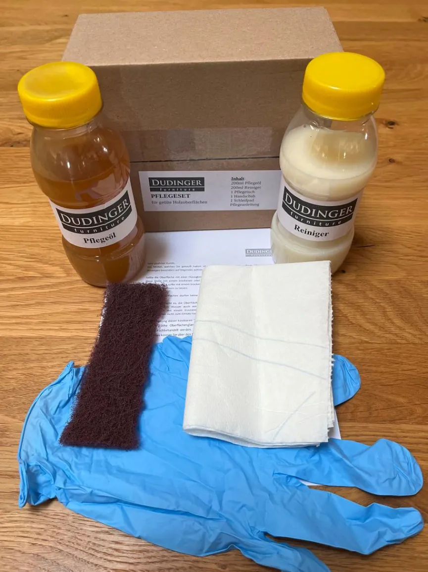 - Mit 200 ml Öl, 200 ml, Reiniger, Schleifflies, Tuch und Einweghandschuhen