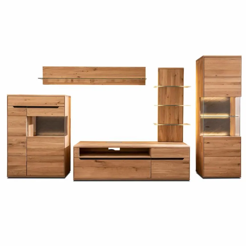 Dank ihrer trendigen Asymmetrie ist die schicke Wohnwand Melilla ein echter Hingucker in jeder Wohnkulisse. Sie kommt mit natürlich gemaserten Echtholz-Fronten und filigranen Griffen daher und trifft so souverän den gestalterischen Nerv der Moderne. Kombinieren Sie die Wohnwand Melilla mit anderen Möbeln im passenden Holzton!