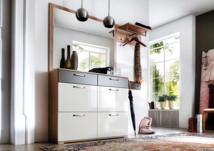 - Garderobe aus Schuh-Klappschrank, Spiegel, Garderobenpaneel und Hakenleiste