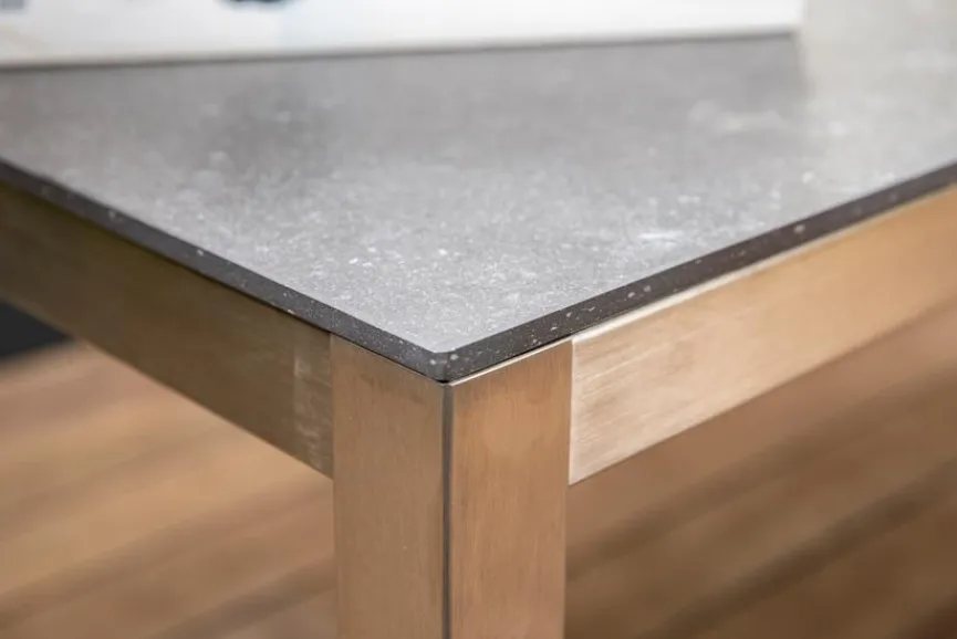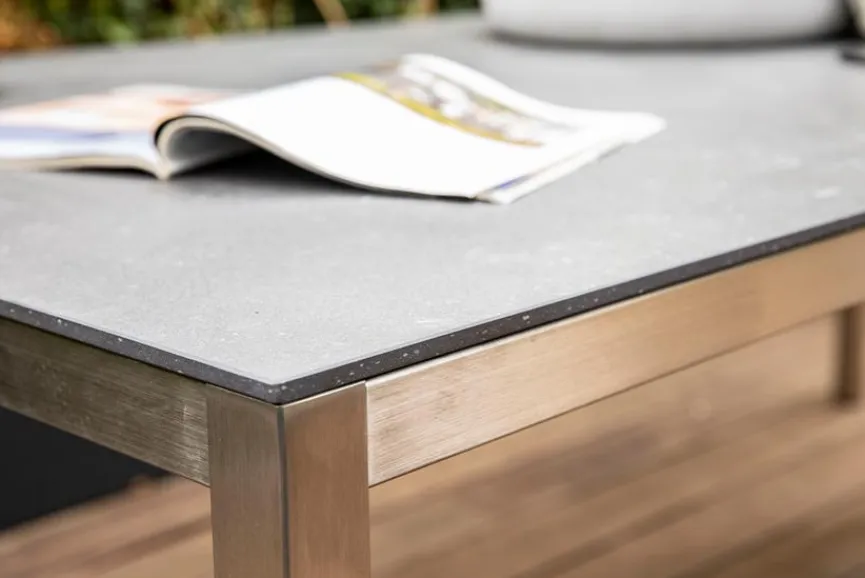 Tische mit Edelstahlgestell und einer Tischplatte aus Porzellankeramik sind bestens für den Außen- und Innenbereich geeignet. Dank der witterungs- und UV-beständigen Eigenschaften ist ein vielfältiger Einsatz möglich. Tischplatten aus Porzellankeramik überzeugen durch ihre Hitze- und Kratzunempfindlichkeit sowie durch ihre Frost-, Hitze- und Feuerbeständigkeit. Porzellankeramik ist darüber hinaus äußerst pflegeleicht und sehr hygienisch.