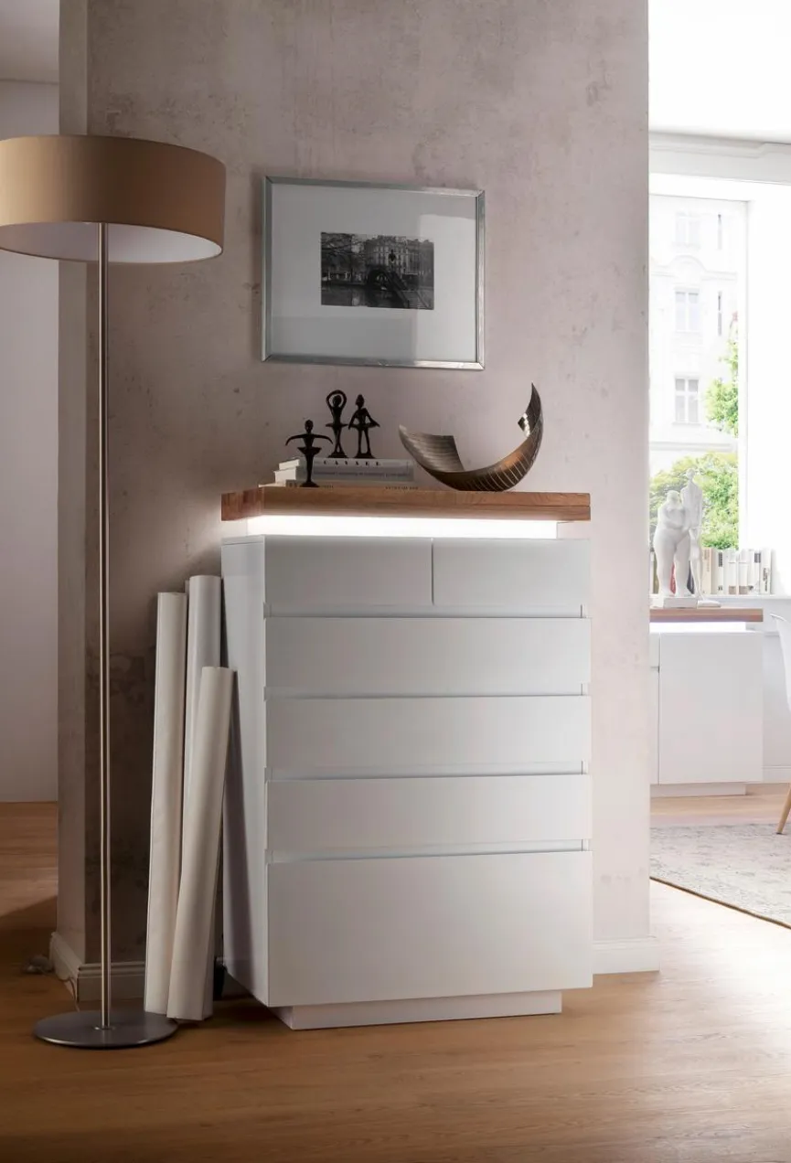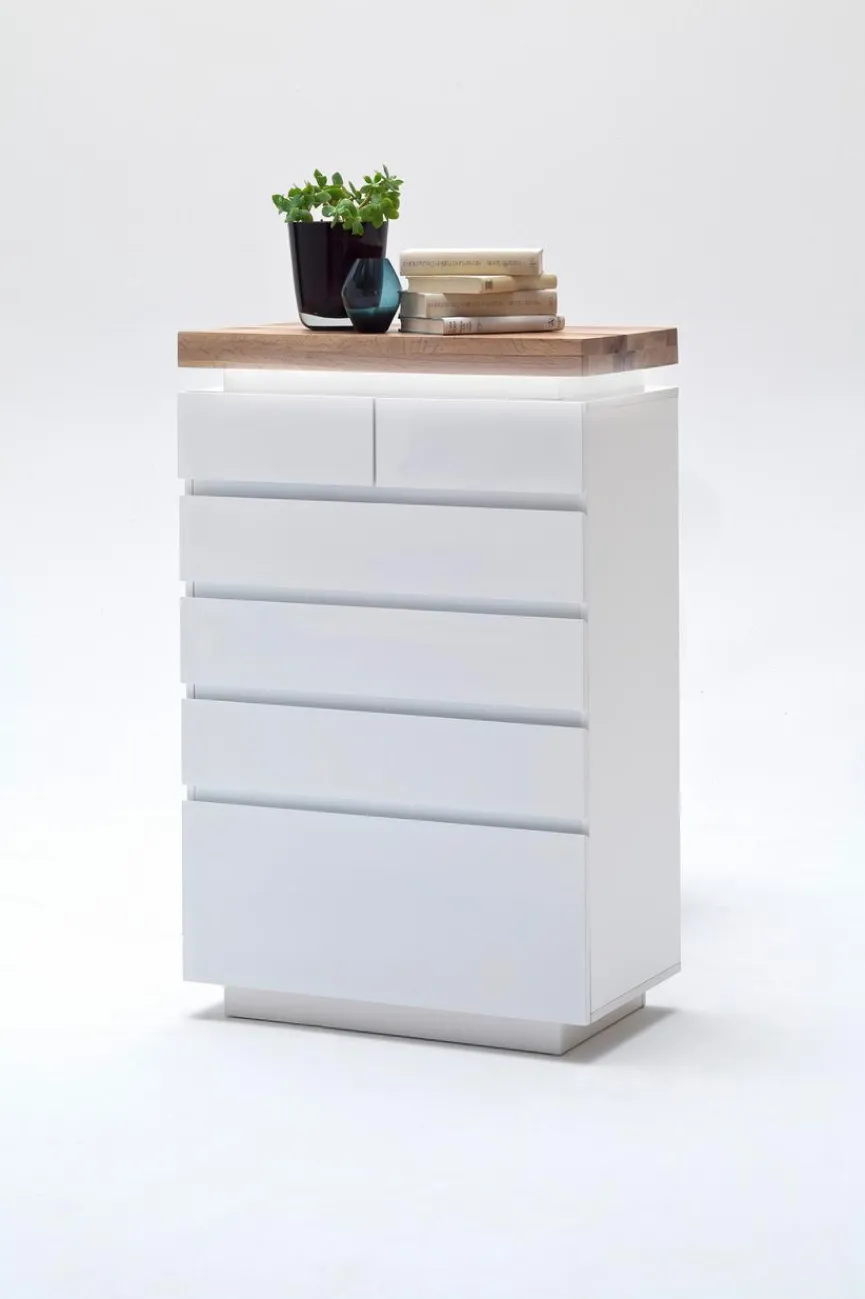 MCA präsentiert mit der kompakten Kommode Romina ein attraktives Möbelstück, das jede Einrichtung bereichert und für zusätzlichen Stauraum sorgt. Ein besonderes Highlight stellt die dimmbare LED-Beleuchtung dar, die sich unterhalb der Deckplatte befindet und mittels einer Fernbedienung den persönlichen Präferenzen angepasst werden kann. Auf der Oberseite der hochwertigen Kommode Romina lassen sich dekorative Objekte oder andere Dinge platzieren.