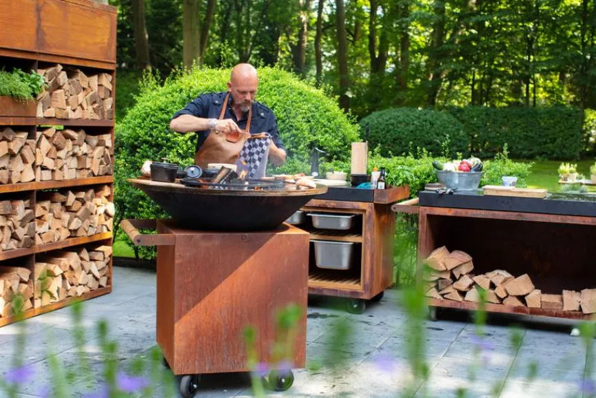 Mit der Outdoor-Kochstelle Classic Corten 100 Pro genießen Sie die gemütliche Atmosphäre eines knisternden Feuers und haben gleichzeitig die Gelegenheit, mit Ihrer Familie oder Freunden im Freien Gerichte zuzubereiten. Der breite, flache Rand des Outdoor-Küchengeräts fungiert als Kochfläche, auf der Sie Ihre Speisen garen, braten oder grillen können. Dank des witterungsbeständigen Materials ist es möglich, die Outdoor-Kochstelle Classic Corten 100 Pro ganzjährig draußen zu lassen.
