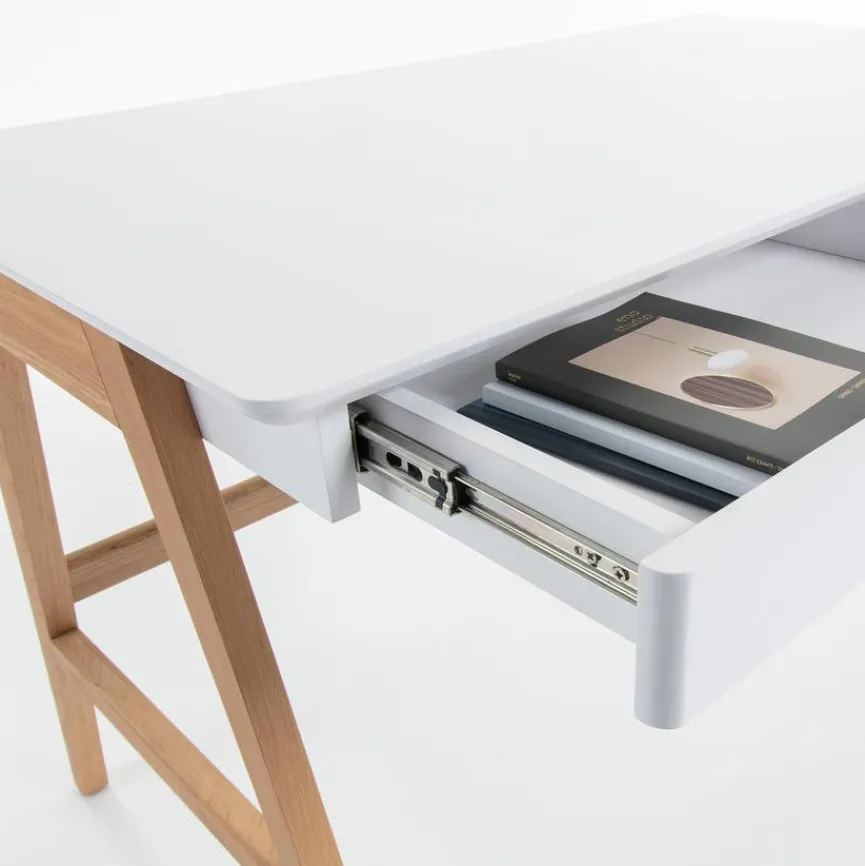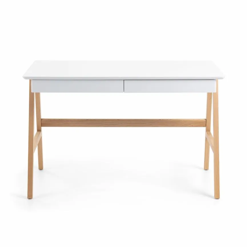 Der Schreibtisch Dyana des spanischen Unternehmens Kave Home beeindruckt mit Eleganz und Minimalismus. Seine weiß lackierte Platte wirkt leicht und elegant, die stabilen Beine aus Eschenholz verleihen dem Tisch Natürlichkeit. Zwei leichtgängige Schubladen bieten Platz für ein Laptop und Schreibutensilien. Der Schreibtisch Dyana ist ideal für Homeoffice und Telearbeit. Er passt sich jedem Wohnstil an und gibt dem Raum eine gemütliche und gleichzeitig hochwertige Note.