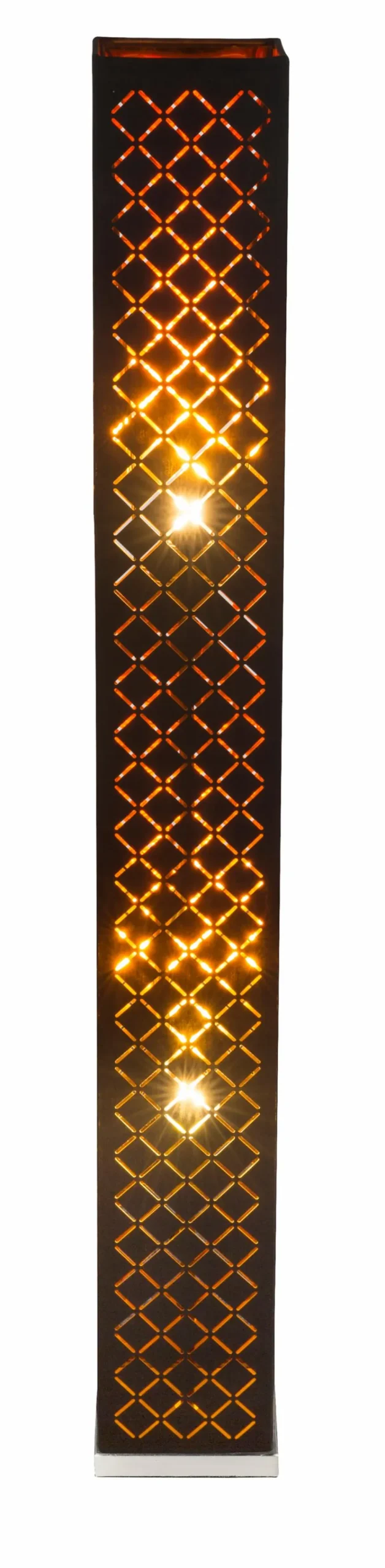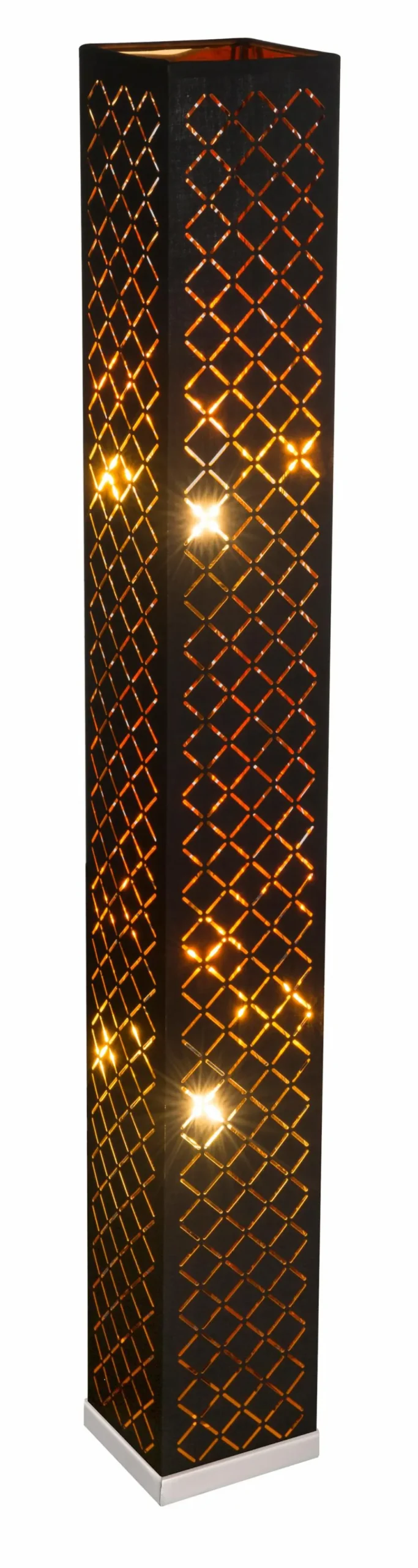 Die Stehlampe Clarke aus dem Hause Globo brilliert mit einer modernen, rechtwinkligen Formgebung, wartet aber auch gleichzeitig mit sehr dekorativen Designaspekten auf. Blattgold und markante Stanzungen, die eine gitterartige Struktur abbilden, verleihen dieser Stehleuchte aufregende Akzente. Zur Ausstattung der Stehlampe Clarke von Globo gehört ein Schalter.
