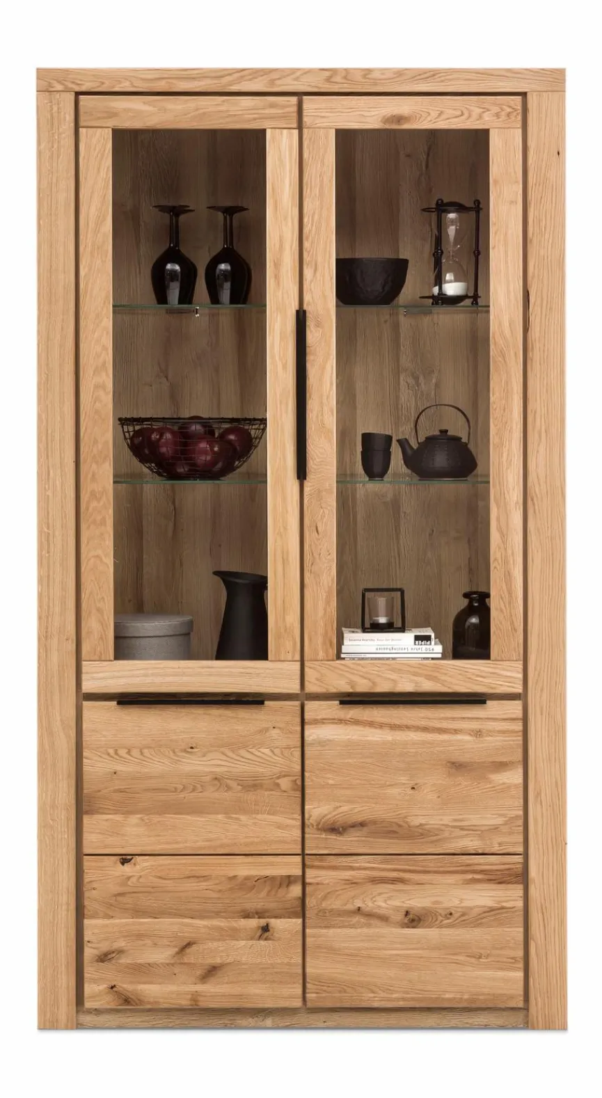 Hinter ihrer großen Doppeltür aus Klarglas bietet die Vitrine Greta auf drei Ebenen Platz, um Ausstellungstücke wirkungsvoll in Szene zu setzen. Im unteren Teil der Glasvitrine befinden sich nützliche Aufbewahrungsmöglichkeiten für Dinge, die nicht sichtbar sein sollen. Massive Naturholzfronten in heller Eiche verleihen der Vitrine Greta eine wohnliche Ausstrahlung.