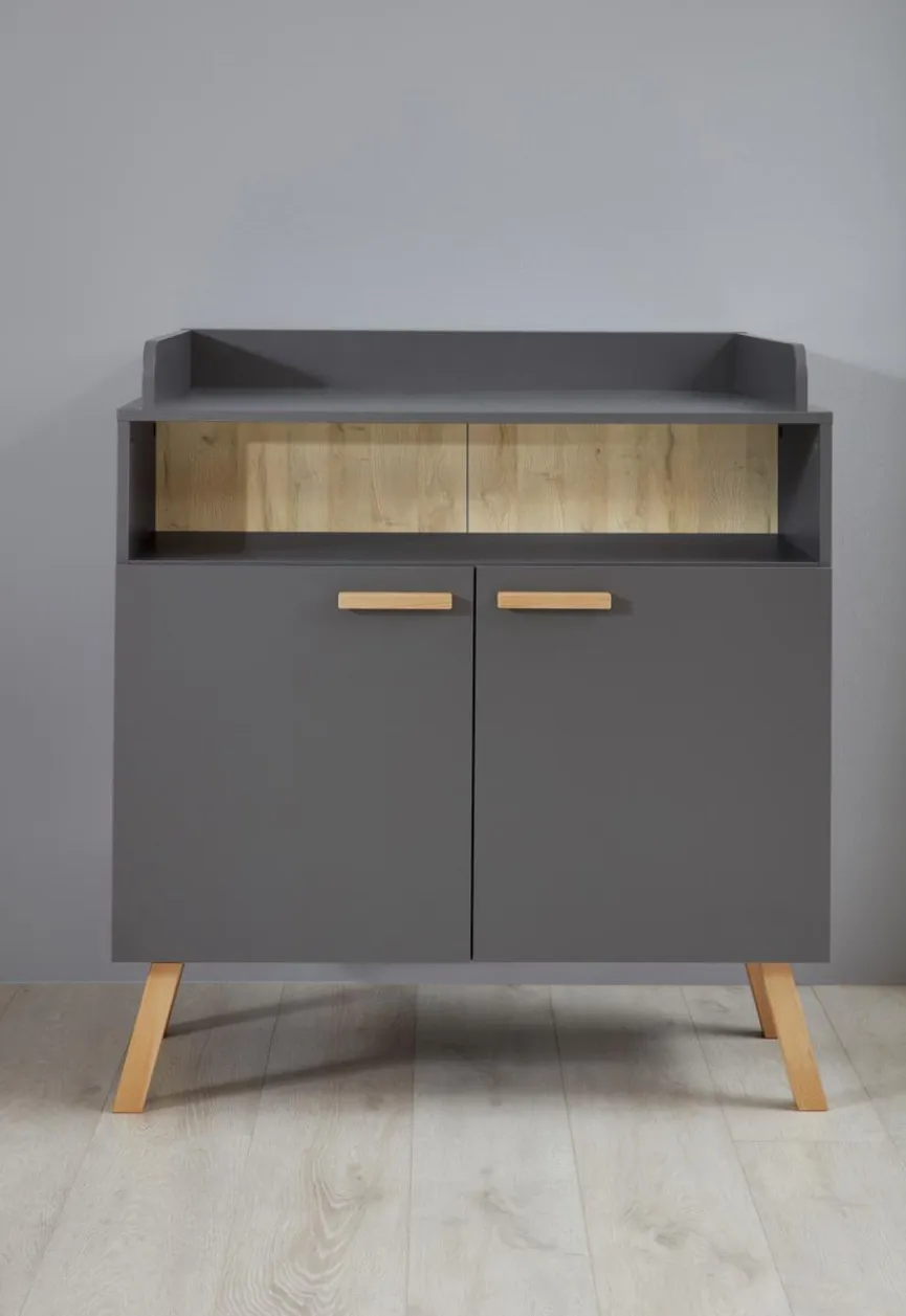 - Mit abnehmbarem Wickelaufsatz, 2 Türen, 1 Einlegeboden und 1 offenen Fach