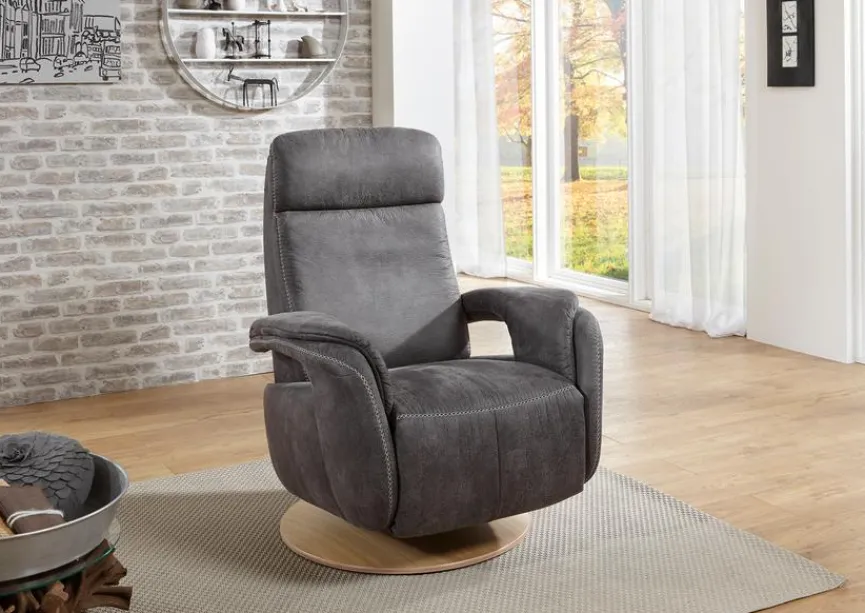 - Bezug aus Mikrofaser (Taurus) in grau und Kontrastnaht in Kreuzstich beige, Fuß Holzdrehteller eiche bianco