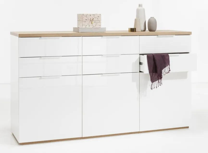 Composad präsentiert mit der Kommode Mundi ein schickes und funktionelles Möbelstück. Durch die Hochglanzfront und die farblich abgesetzte Abdeckplatte erhält das Sideboard ein attraktives Äußeres. Im sinnvoll strukturierten Innenraum bietet die Kommode Mundi von Composad viel Stauraum für die gut geordnete Aufbewahrung verschiedener Gegenstände.