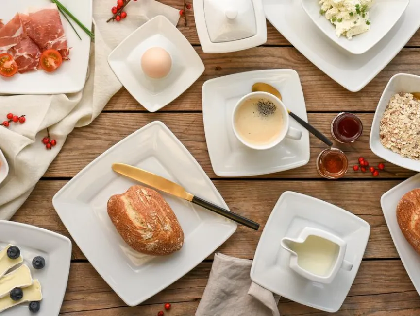 - Je 6 Speiseteller 26 cm, Suppenteller 22 cm, Frühstücksteller 21 cm, Kaffeetassen 200 ml, Kaffeeuntere 14 cm, Kaffeebecher 300 ml, Müslischalen 14 cm, Eierbecher 14 cm und je 1 Milchgießer 150 ml, Zuckerdose 300 ml