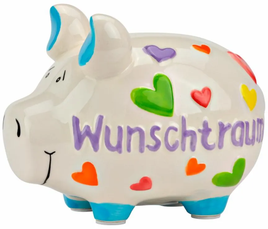 Mit einem schönen Schriftzug motiviert die Spardose Wunschtraum 17×15 cm dazu, öfter einmal Geld beiseitezulegen. Dank der niedlichen Schweinchen-Form und den ansprechend gestalteten Herz-Motiven ist sie zudem eine attraktive Deko. Auch qualitativ kann die aufwendig per Hand verarbeitete Spardose Wunschtraum 17×15 cm auf ganzer Linie überzeugen.