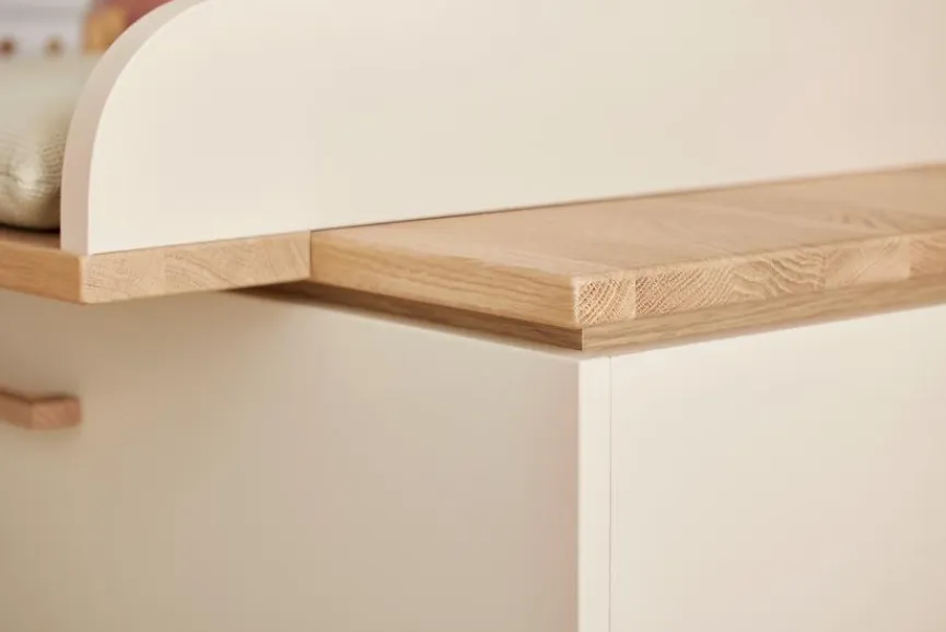 - Aus Holzwerkstoff (Spanplatte) mit kratzfester Melaminharzfolie in Cashmere-Beige, Füße, Griffe, Sockel und Deckplatte sowie Fries des Babybettes aus massiver Eiche