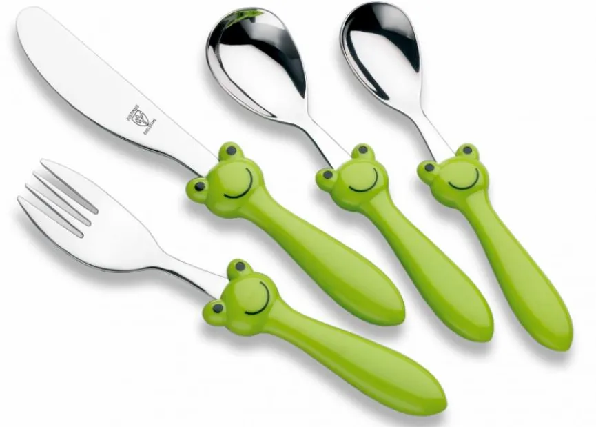 Am Justinus Kinderbesteck Frosch 4tlg. mit Griffen in Gestalt eines fidelen Tiers finden kleinste Gourmets bestimmt gleich großen Gefallen. Wahrscheinlich lernen zukünftige Feinschmecker gern, mit diesem Besteck für Kinder richtig umzugehen. Das Kinderbesteck Frosch 4tlg. von Justinus liegt gut und sicher in kleinen Händen und ist auch ein niedliches und nützliches Geschenk.