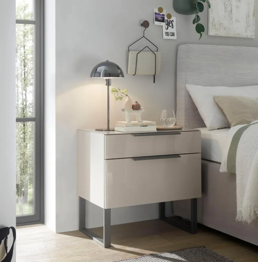 Mit dem eleganten Nachttisch Como von Wiemann runden Sie Ihre Schlafzimmereinrichtung stilsicher ab. So begrüßt Sie bereits am Morgen die stylische Optik der Nachtkonsole, die außerdem als nützlicher Ordnungshelfer fungiert. Hierfür bietet der Nachttisch Como zwei Schubladen, damit Sie auch in der Nacht perfekt organisiert sind und Taschentücher, Medikamente und vieles mehr stets griffbereit haben.