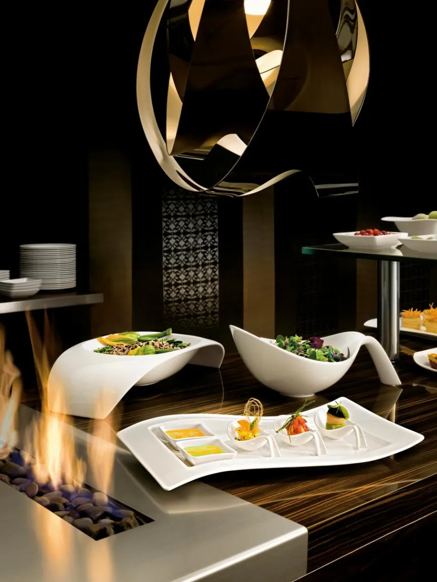 Wer an Geschirr mit extravaganten Formen Gefallen findet, darf sich auf die Platte New Wave von Villeroy & Boch freuen. Mit ihrer asymmetrischen Wellenform wird diese Servierplatte schnell zum Star auf jeder Tafel. Die Platte New Wave aus dem Hause Villeroy & Boch bietet sich zum Beispiel für das appetitliche Anrichten von Häppchen an.