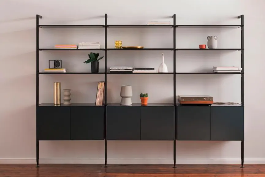 - Gestell aus pulverbeschichtetem Metall in schwarz, Korpus und Fronten aus Holzwerkstoff (MDF) mit Lack in schwarz