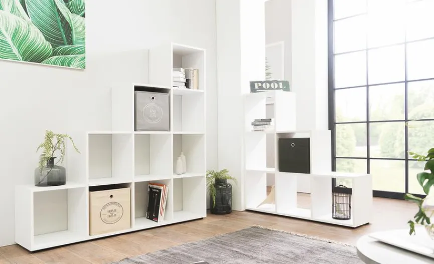 Vier treppenartige Stufen bilden das interessante Regal Udine, das nicht nur als praktisches Wandregal genutzt werden kann. Ebenso stellt das Regal Udine einen wundervollen Raumteiler dar, der einen Raum optisch in zwei Bereiche unterteilt. Die Füße sind unsichtbar angebracht, sodass es scheint, als würde das Regal schweben.