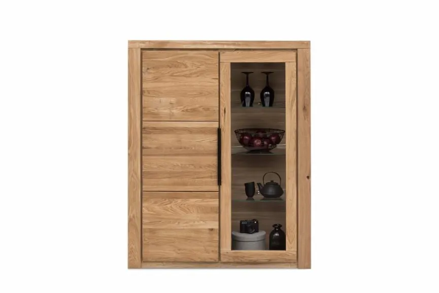 Die Vitrine Greta erfreut ihre Besitzer sowohl durch ihr edles Holzdekor als auch mit dem durch eine Glastür geschützten Bereich. In diesem Abteil der Glasvitrine können Sie auf verschiedenen Ebenen gezielt einige edle Schaustücke Ihrer Porzellansammlung oder andere Kostbarkeiten präsentieren. Auch mit dem Metallgriff zeigt die Vitrine Greta ein stilvoll designtes Element, das den positiven Eindruck abrundet.