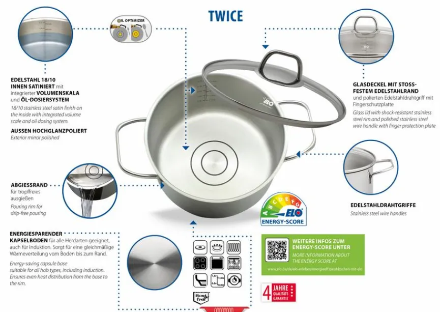 - Hitzebeständig bis 240°C ohne Glasdeckel, mit Glasdeckel bis 180°C