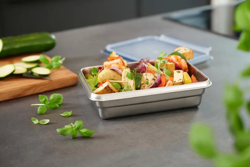 Die frostfeste Vorratsdose Clip & Close Steel 1200 ml von emsa ist ein praktisches Haushaltsutensil, in dem Sie Ihre Lebensmittel auf hygienische Weise aufbewahren oder transportieren können. Bis zu einer Temperatur von 250 °C kann die Edelstahldose auch in den Backofen gestellt werden. Profitieren Sie von den zahlreichen Gebrauchsvorteilen, die Ihnen die leicht zu reinigende Vorratsdose Clip & Close Steel 1200 ml von emsa bietet.