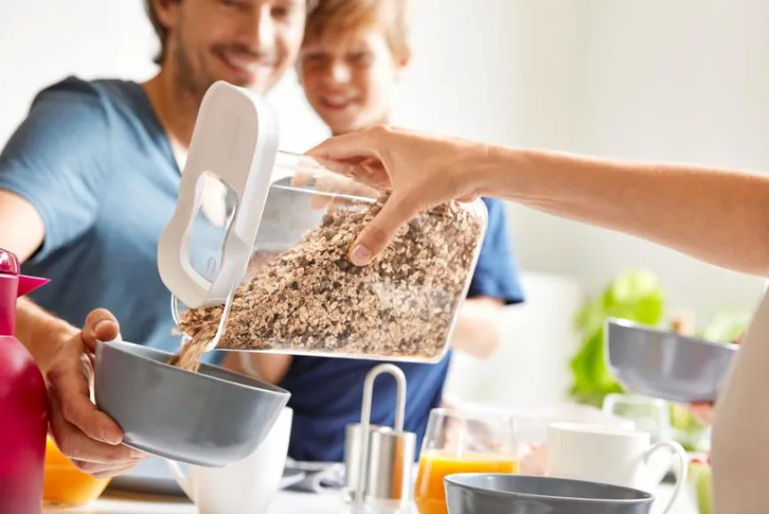 Trocken zu lagernde Lebensmittel wie Kekse, Cornflakes, Knäckebrot und mehr lassen sich bestens in der hygienischen Vorratsdose Optima von emsa unterbringen. In dem robusten Behältnis wird der jeweilige Inhalt zuverlässig vor Feuchtigkeit und Schädlingen geschützt. Mithilfe der schlicht gestalteten Vorratsdose Optima sorgen Sie im Küchenschrank oder in der Schublade zudem für Ordnung.