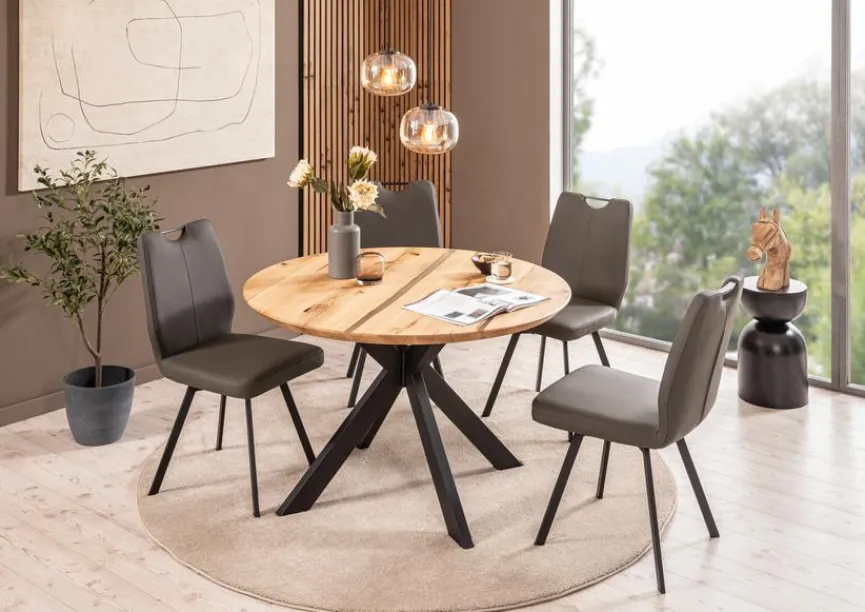 Mit dem Esstisch Lexington Ø 120cm treffen Sie eine ästhetische und qualitativ hochwertige Wahl. Eine Platte aus massiver, geölter Wildeiche lässt im Zusammenspiel mit einem attraktiv gestalteten Metallgestell eine Optik entstehen, die diesen Esszimmertisch zu einem Highlight für Wohneinrichtungen unterschiedlichster Art werden lässt. Zudem überzeugt der Esstisch Lexington Ø 120cm mit einer stabilen, exzellenten Verarbeitung.
