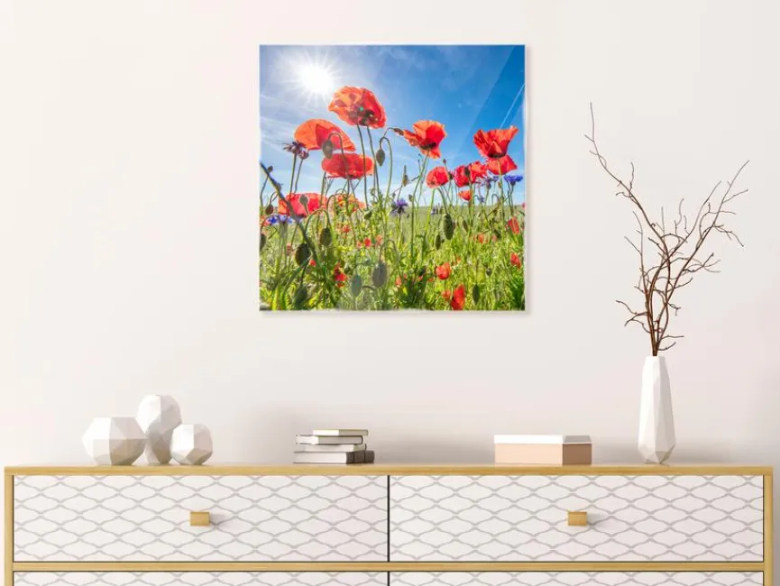 Mit Farbenpracht und ungetrübtem Sonnenschein verkündet das Glasbild 50×50 cm Poppies IV von EUROART den Beginn eines strahlenden Sommers. Wenn der Mohn auf den Feldern blüht, dann meist nicht lange, aber mit fulminanter Schönheit. Diese Stimmung können Sie mit dem Glasbild 50×50 cm Poppies IV jetzt in Ihre persönliche Umgebung transportieren, sei es im Wohnbereich oder im Büro.