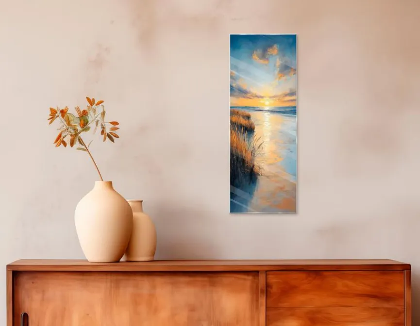 Wenn Sie sich keine romantischere Szene als einen Sonnenuntergang am Meer vorstellen können, dann sollten Sie sich das Glasbild 30×80 cm Atmospheric Beach III von EUROART unbedingt nach Hause holen. Angesichts der herrlichen Farben werden Sie das Meer förmlich rauschen hören und das Salz in der Luft schmecken. Verschönern Sie mit dem Glasbild 30×80 cm Atmospheric Beach III auch Ihre Praxis.