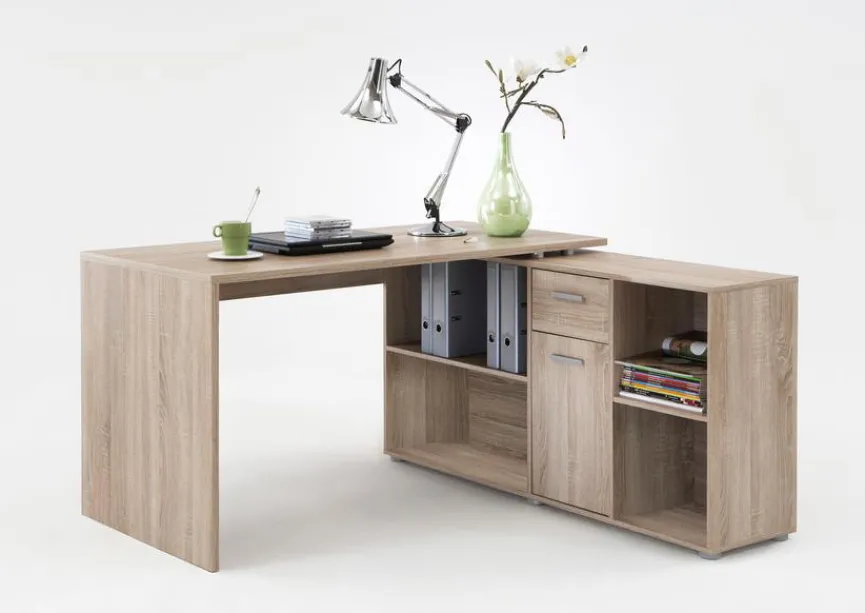Als besonders praktisch erweist sich, dass der Schreibtisch Lagos von FMD rechts und links sowie gerade montiert werden kann. Er ist also je nach Wunsch als Eckschreibtisch nutzbar oder als länglicher Arbeitsplatz. Der edle Schreibtisch Lex der Marke FMD bietet in den vier offenen Fächern viel Platz für DIN A4 Ordner.