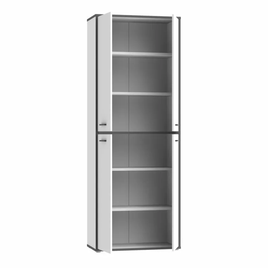 - Aus Holzwerkstoff (Spanplatte) in Weiß, Kontrastkante aus Holzwerkstoff (Spanplatte) in Uni Wolfram Grau, Rückwand aus Holzwerkstoff (HDF-Platten) in Weiß, Griffe aus Kunststoff in Grau