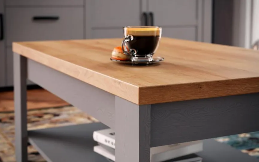 - Korpus besteht aus Holzwerkstoff (Spanplatte) in Eiche Grau. Front besteht aus Holzwerkstoff (Spanplatte) in Riviera Eiche