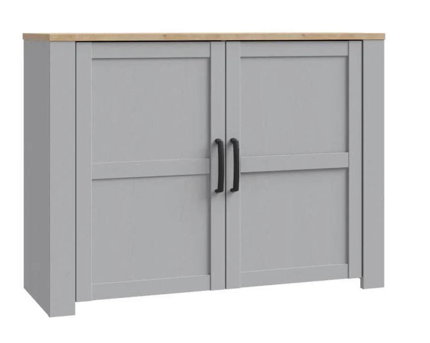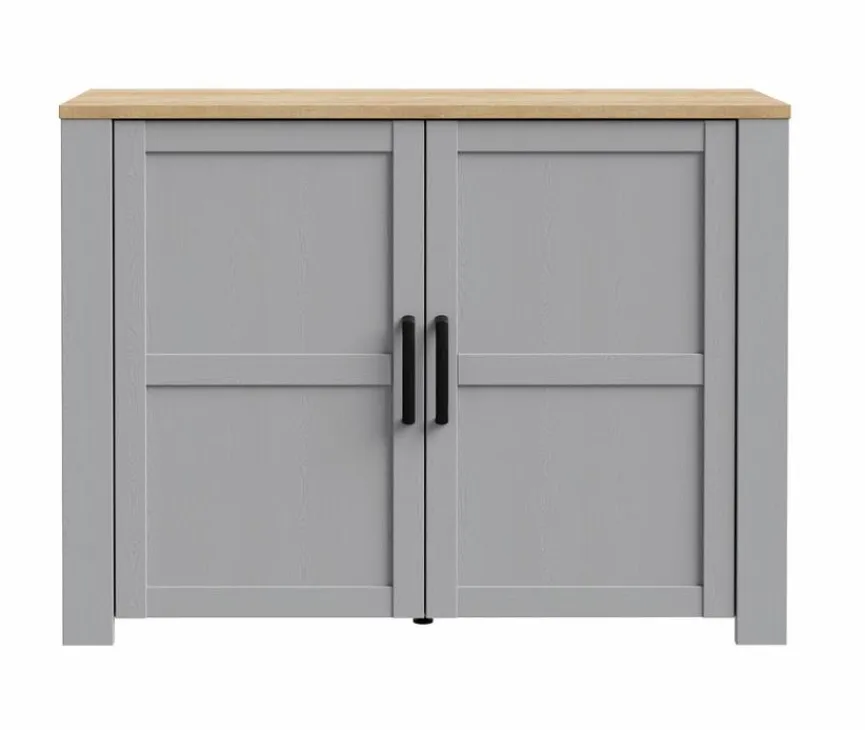 - Rückwand besteht aus Holzwerkstoff (HDF) in Eiche Grau, Korpus besteht aus Holzwerkstoff (Spanplatte) in Eiche Grau. Front besteht aus Holzwerkstoff (MDF) in Eiche Grau. Absetzung in Riviera Eiche mit Kratzfester Melaminharzfolie