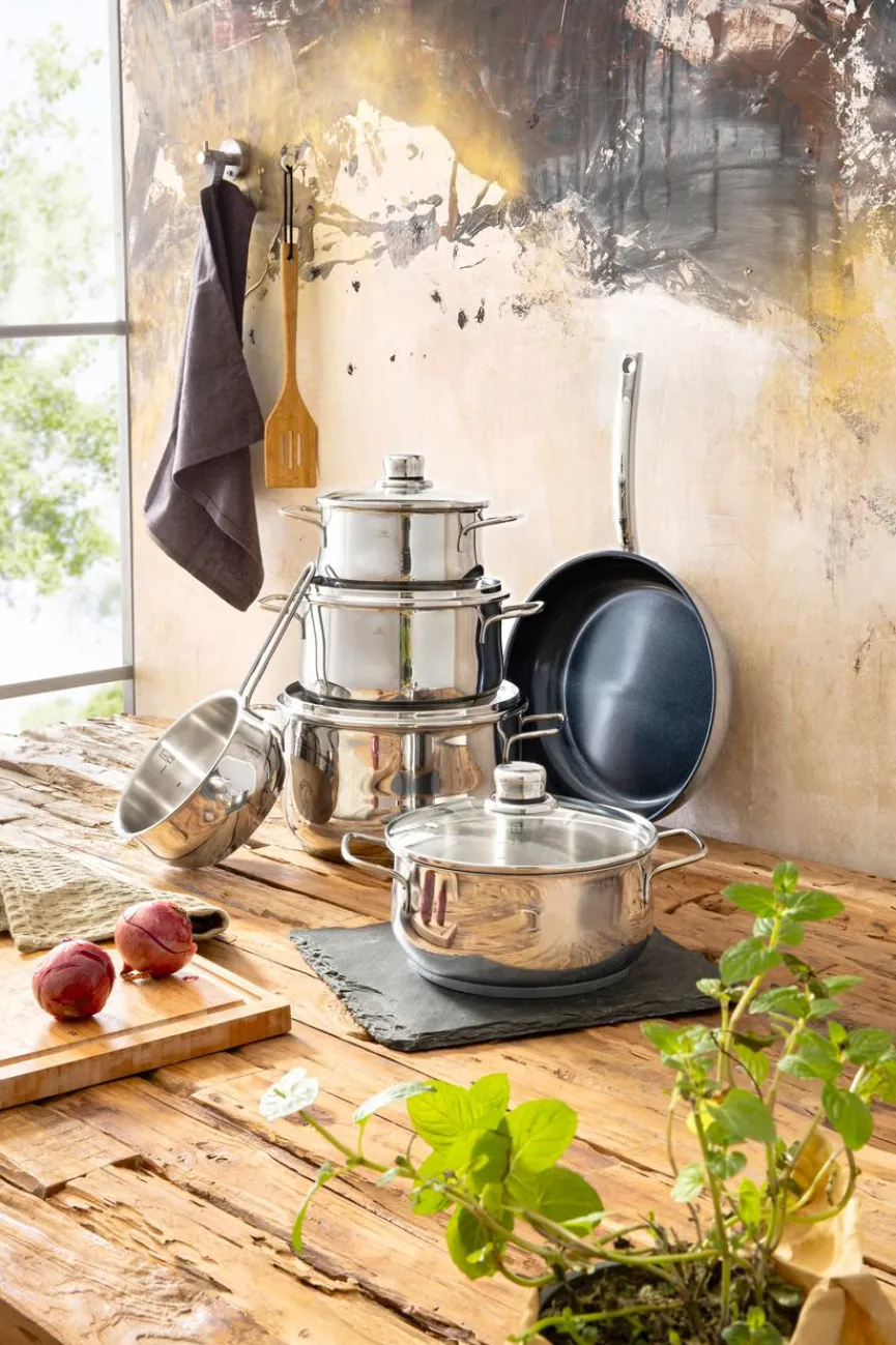 - Artikel beinhaltet je 1x Kochtopf Ø 16 cm, Ø 20 cm, Ø 24 cm, Bratentopf Ø 20 cm, jeweils mit Glasdeckel, Stielkasserolle Ø 16 cm und Pfanne Ø 28 cm