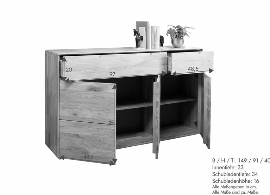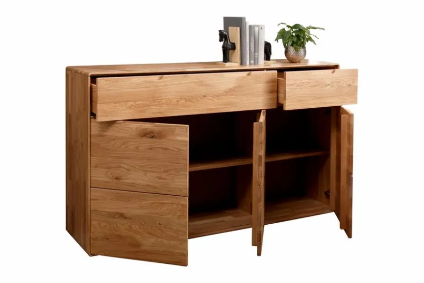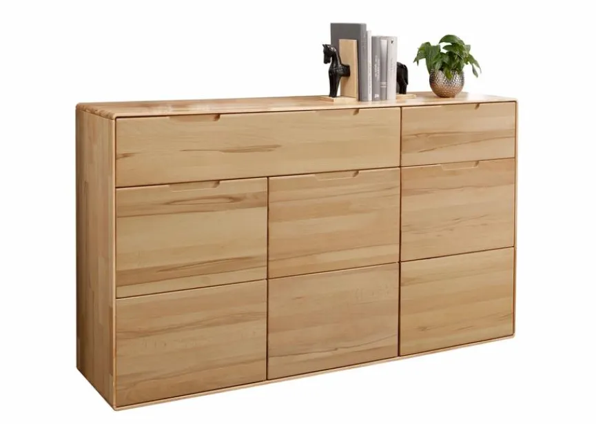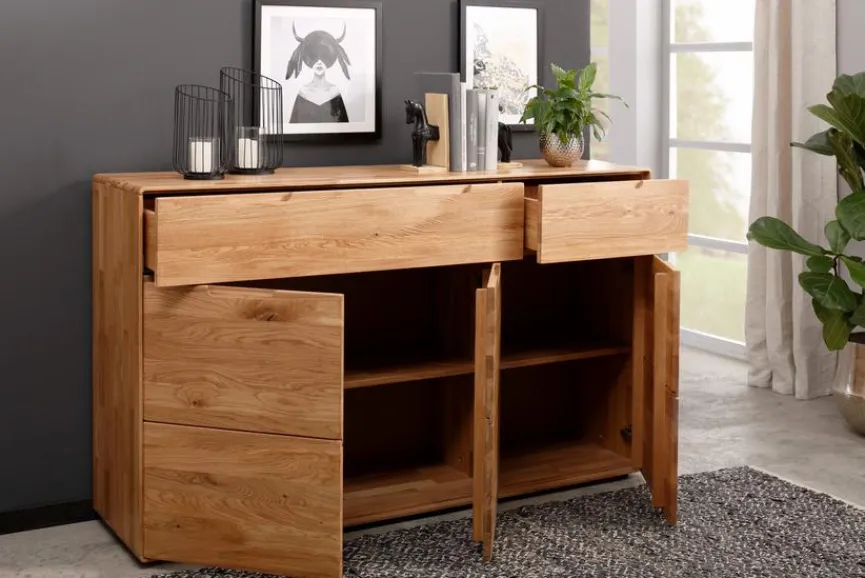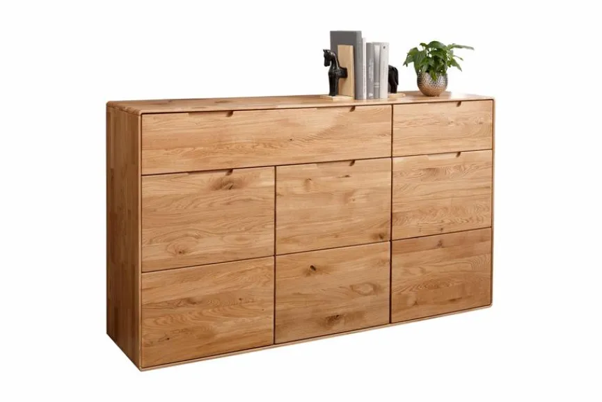 Bei der Kommode Stockholm von G+K verschmelzen geradlinige Form und warm wirkendes Material nahtlos miteinander. Dieses Sideboard im einladenden Scandi-Stil verströmt nicht nur Freundlichkeit, sondern trägt auch zu einem ordentlichen Ambiente bei. In der Kommode Stockholm lassen sich von Geschirr bis zu Wäsche über Gebrauchsobjekte bis hin zu Heimtextilien jegliche Art von Gegenständen organisiert aufbewahren.