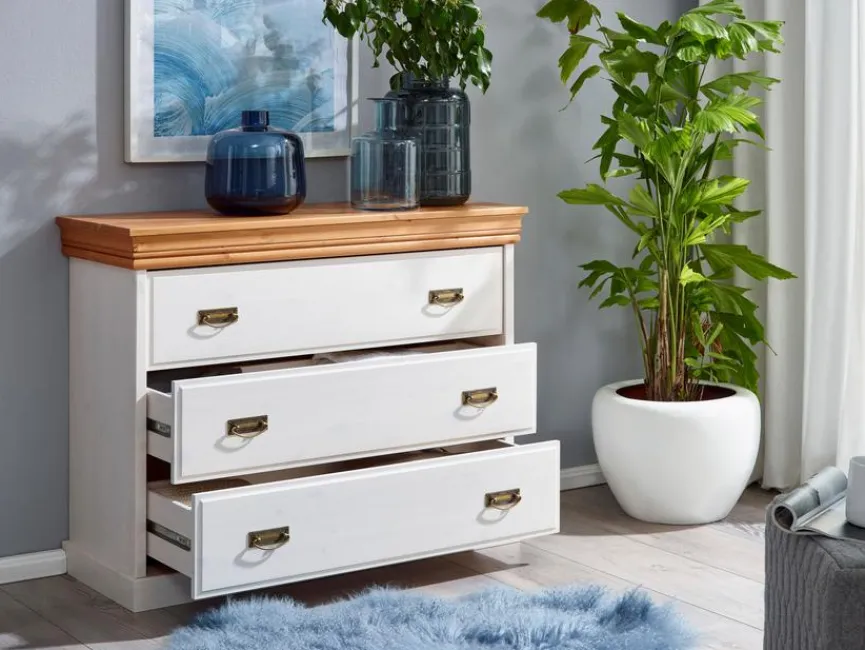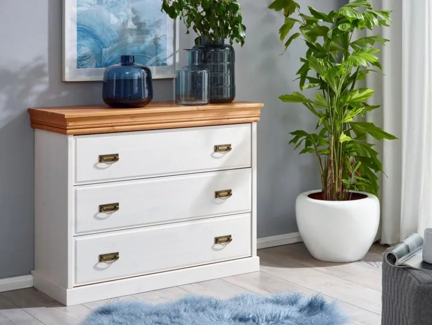 Sollten Sie ein Liebhaber des Landhausstils sein, wird Sie die Kommode Hombre begeistern. Dieses Möbelstück überzeugt mit seinem rustikalen Charme und setzt durch seinen markanten Auftritt ein Zeichen. Die Kommode Hombre bietet zudem in ihren großen Schubläden reichlich Platz für Wäsche oder andere Utensilien, die im Schlafzimmer zu verstauen sind.