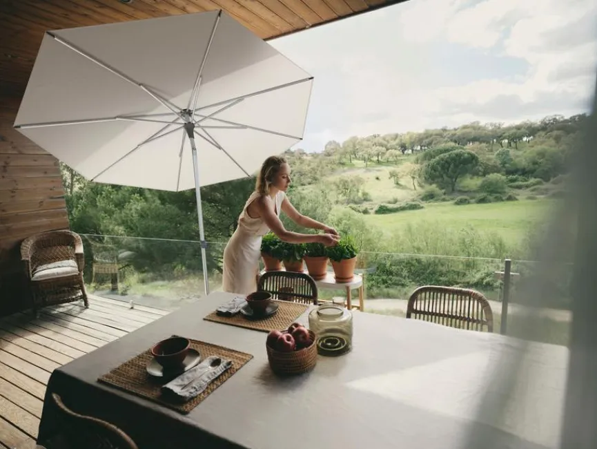 - Schirmbezug ist auswechselbar, hat die Stoffklasse 2