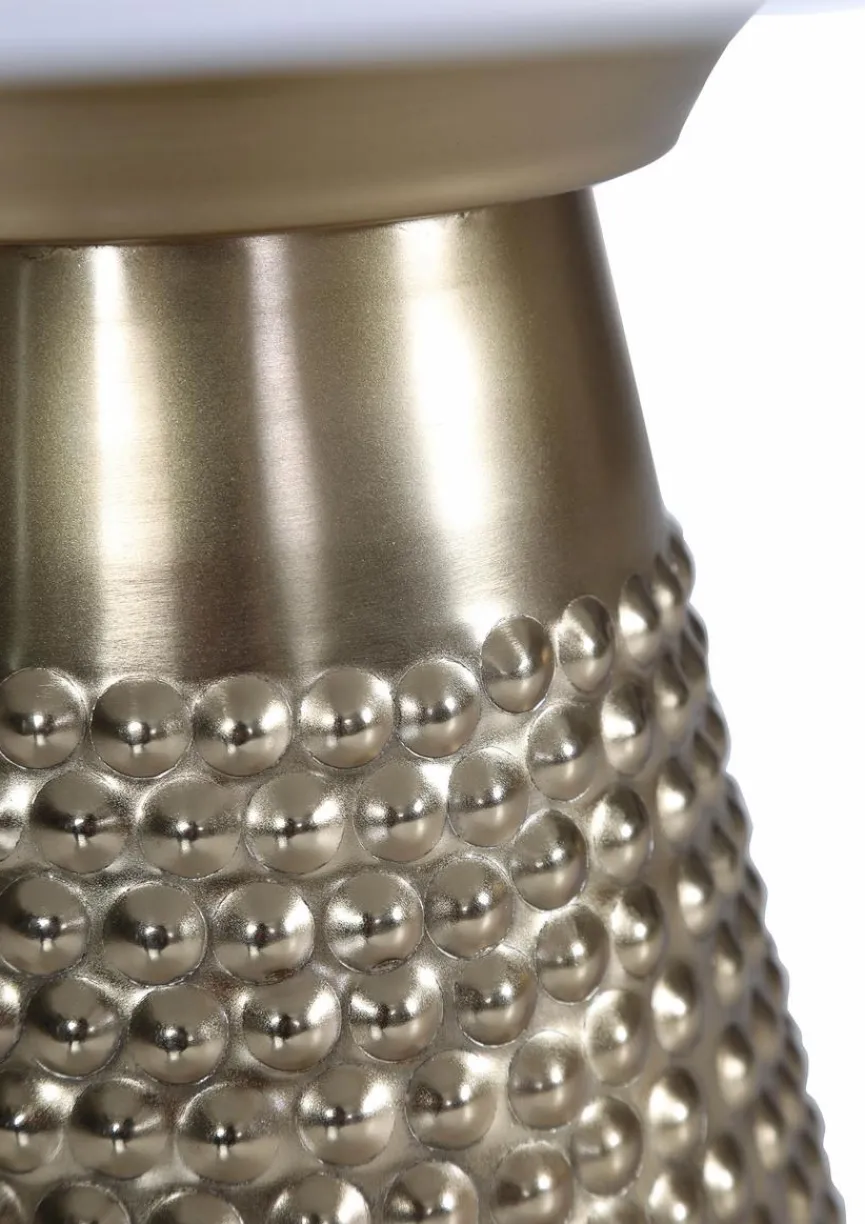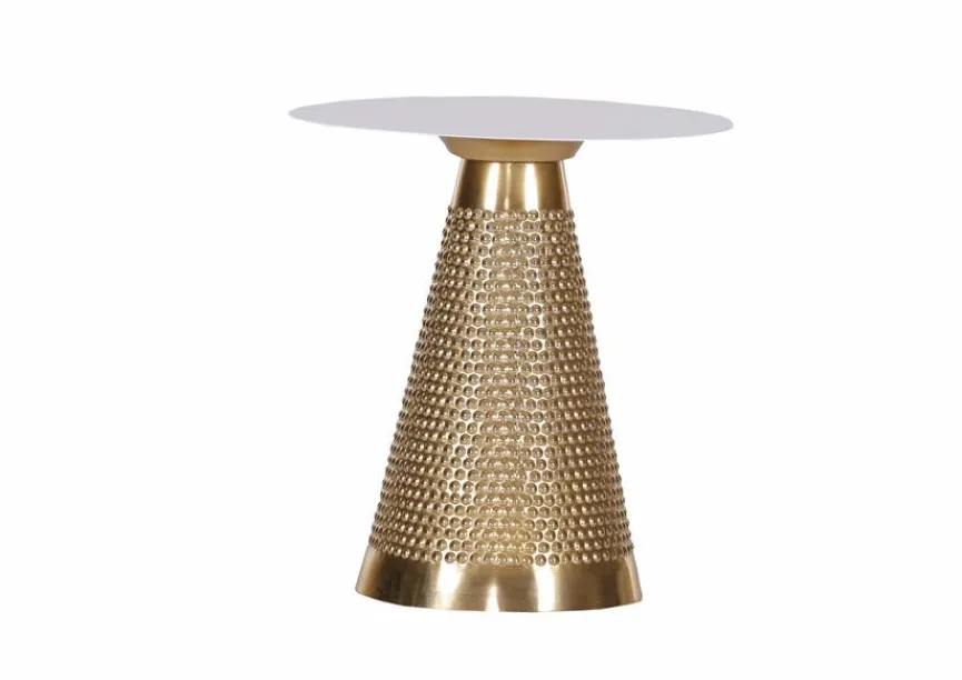 Der Beistelltisch Criss & Cross von Gutmann Factory vereint auffällige Eleganz mit moderner Formensprache. Der konisch zulaufende Fuß in Goldoptik besticht durch seine strukturierte Oberfläche und setzt edle Akzente im Raum. Die runde Tischplatte bildet dazu einen harmonischen Kontrast. Ob im Wohnzimmer, neben dem Sofa oder als stilvolle Ablage im Flur, der Beistelltisch Criss & Cross bringt Charakter in jedes Ambiente.
